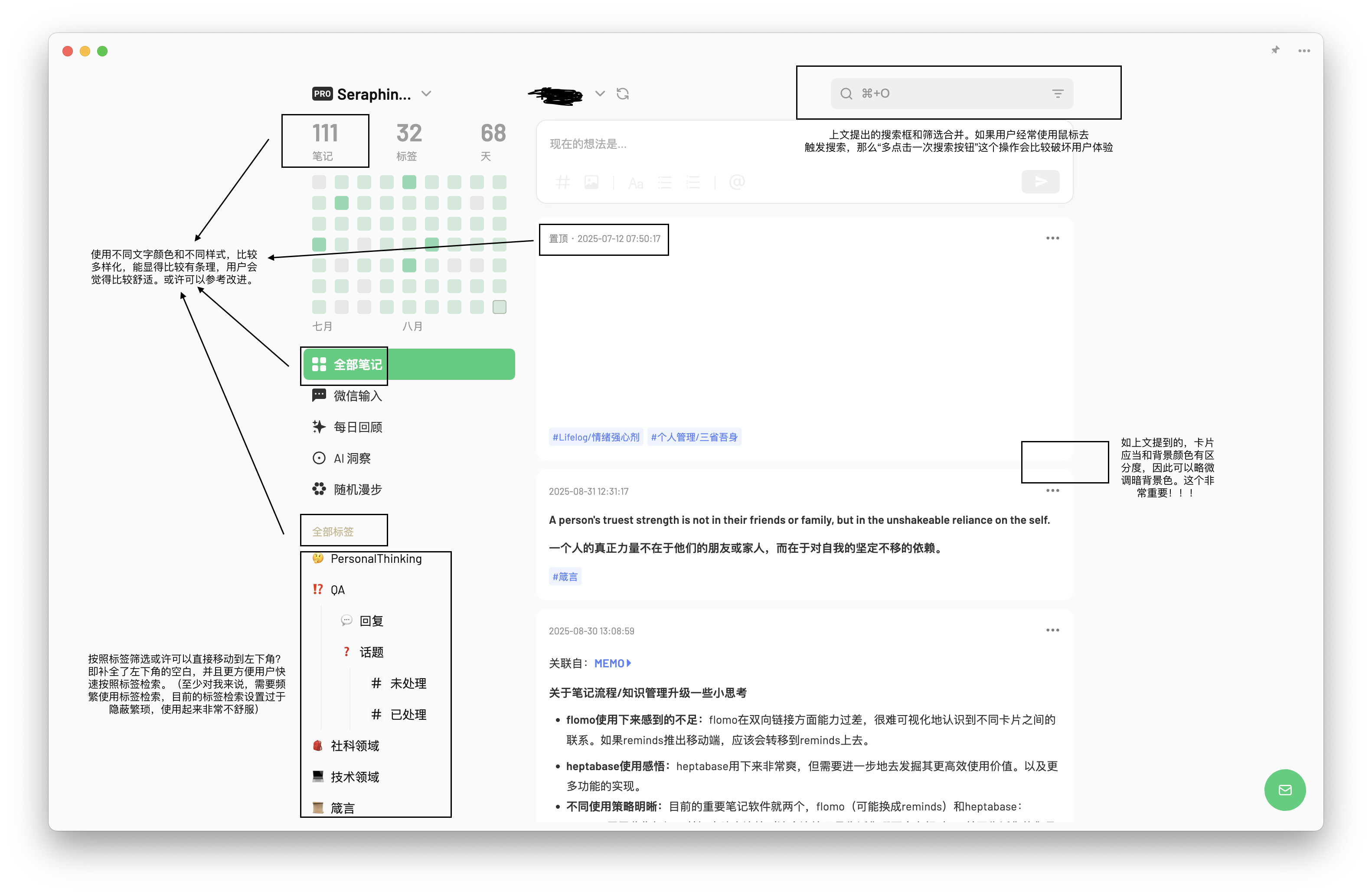 - 在列表视图下,卡片和背景色没有区分,同时卡片边框过窄,导致边界感不明显,有点混乱;或许可以参考flomo等软件略微调深背景色保证区分能力。